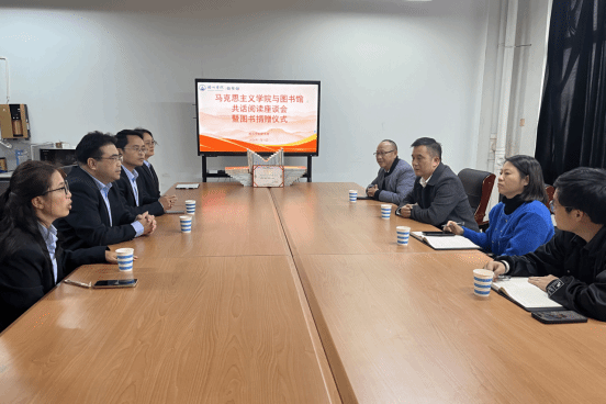 为深入推动书香校园建设,促进优质资源共享,深化图书馆与二级学院间的协同育人机制,1月16日下午,马克思主义学院与图书馆在馆内三楼会议室举行阅读交流座谈会暨图书捐赠仪式。马克思主义学院院长书记冀宁、院长唐景成、尹杰钦教授、梁誉老师、图书馆馆长刘卫东及图书馆相关业务主管共同出席活动。